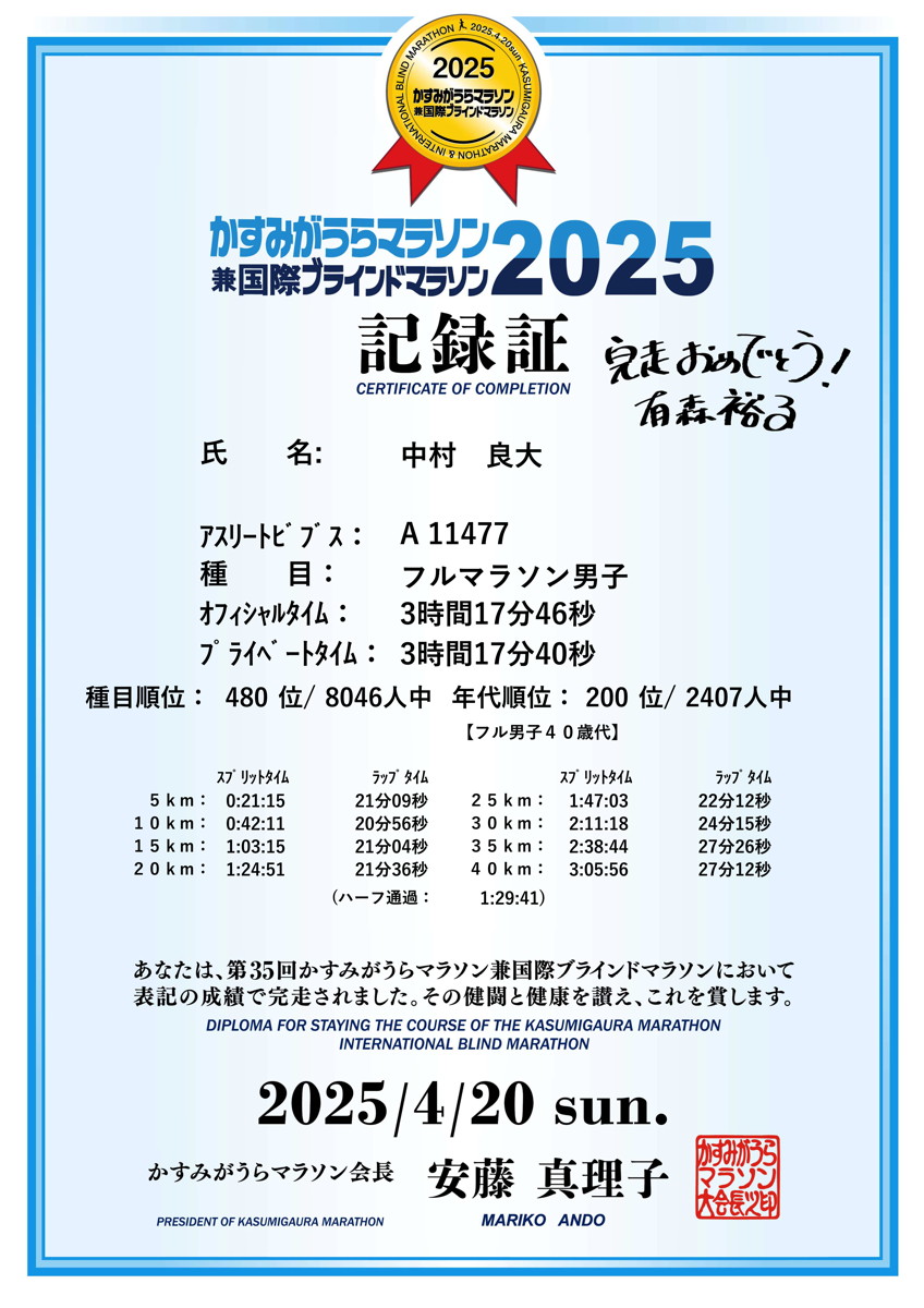 ラスト200mは脚がほぼ攣っていてぴくぴくさせながらのフィニッシュ、3時間17分46秒という、思いがけない失速レースとなった。理由は調整不良とはっきりしているので、こんな年もあるさと切り替えるしかない。いくら頭脳と容姿がガキンチョでも、身体の回復力は齢相応に落ちていることに向き合え。