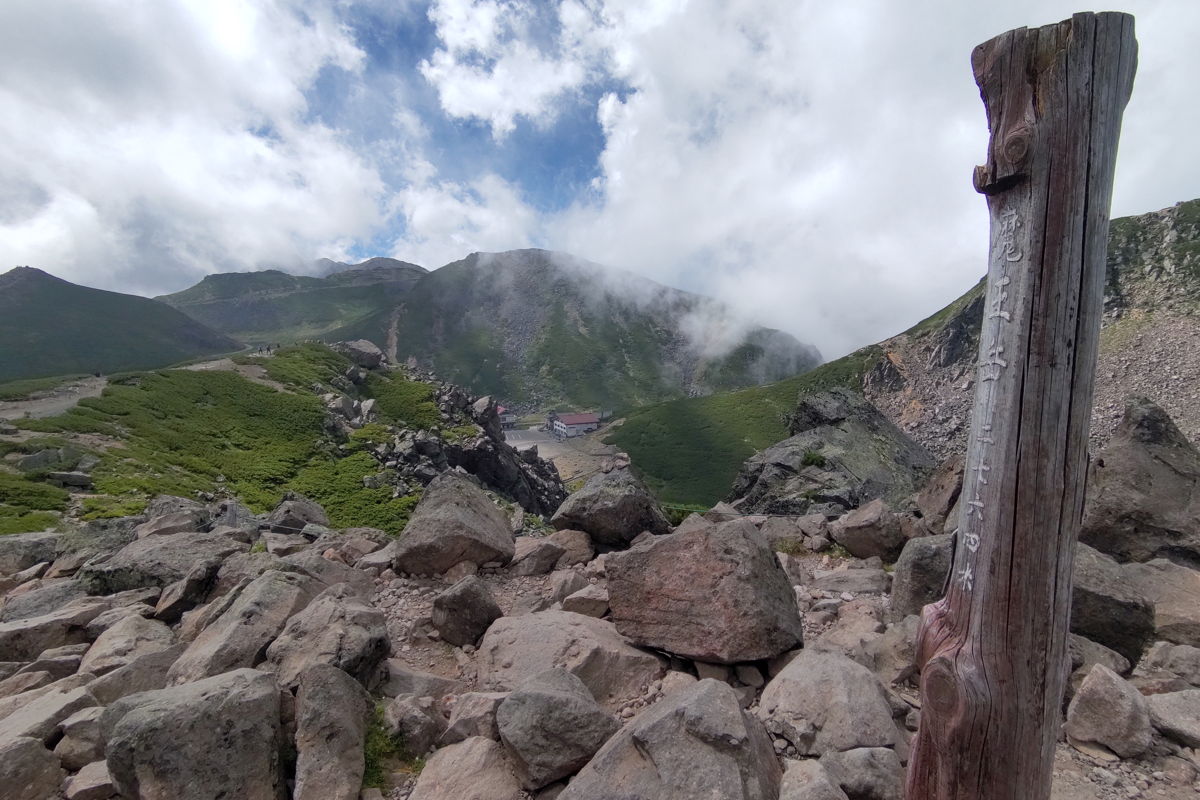 K原さんもフィニッシュ。昨日「一緒に富士見岳を登山しようぜ」と話していたが、だいぶガスって来て槍穂が隠れたし…いや私の気力不足で、すぐ裏にある魔王岳に変更して貰う。ここでもゴールエリアより一段上の山岳風景が楽しめるんだ。アニメ「mono」の聖地である。