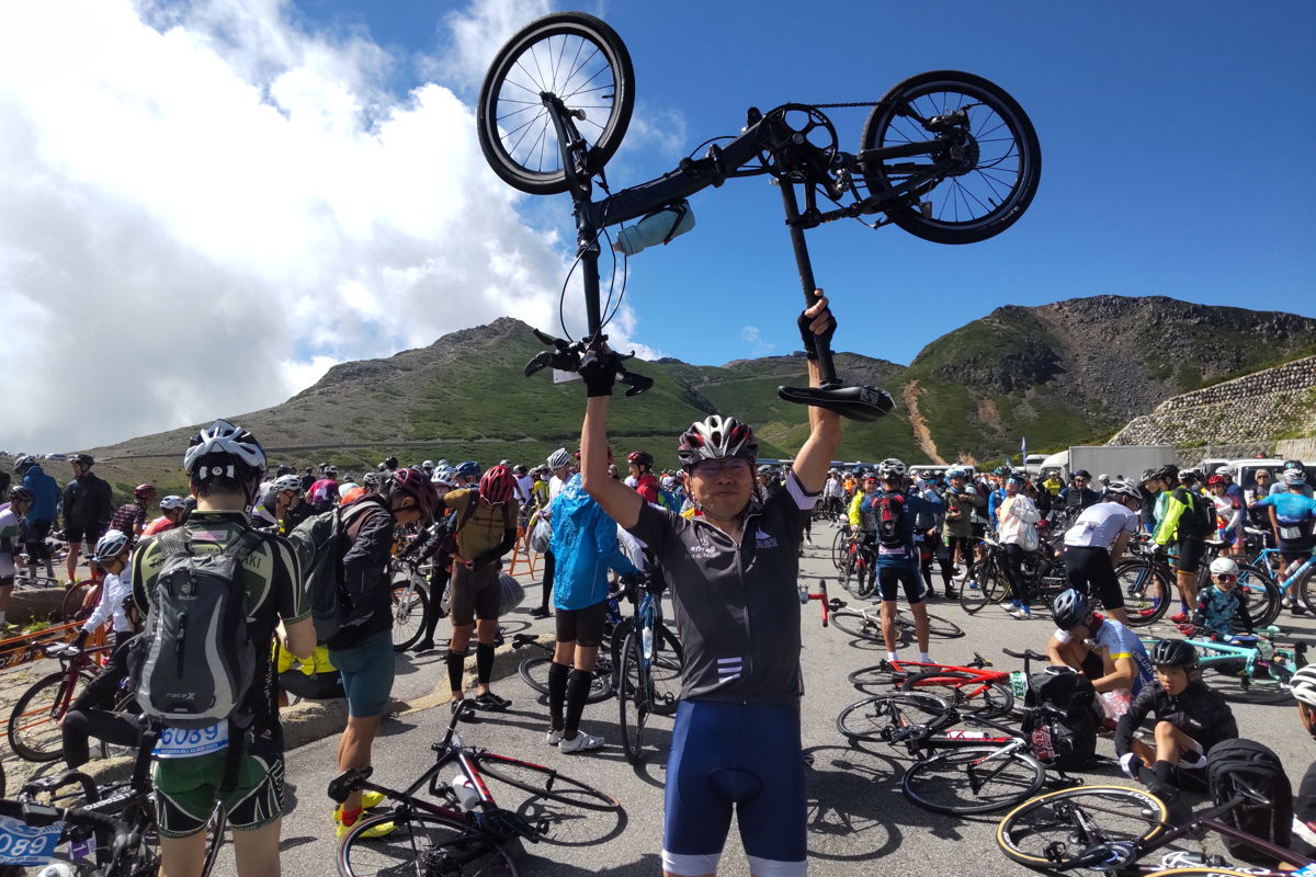 ほらこんな素晴らしい景色の中を、、、なんでこんな苦しい走りをしているのか。もう1秒たりとも落とせない。「ミニベロがんばれー」という声が何処かから聞こえる。よっしゃ頑張るよと心の中だけで返す。周りのライバル達だって頑張っているんだ。5分半くらいのラップを刻んで、残り1kmで残り4分半ほど(記憶は曖昧)。もうギア2速縛りで、重くても痛くても踏み込め! 残り300mで残り1分切った!?ああああ。