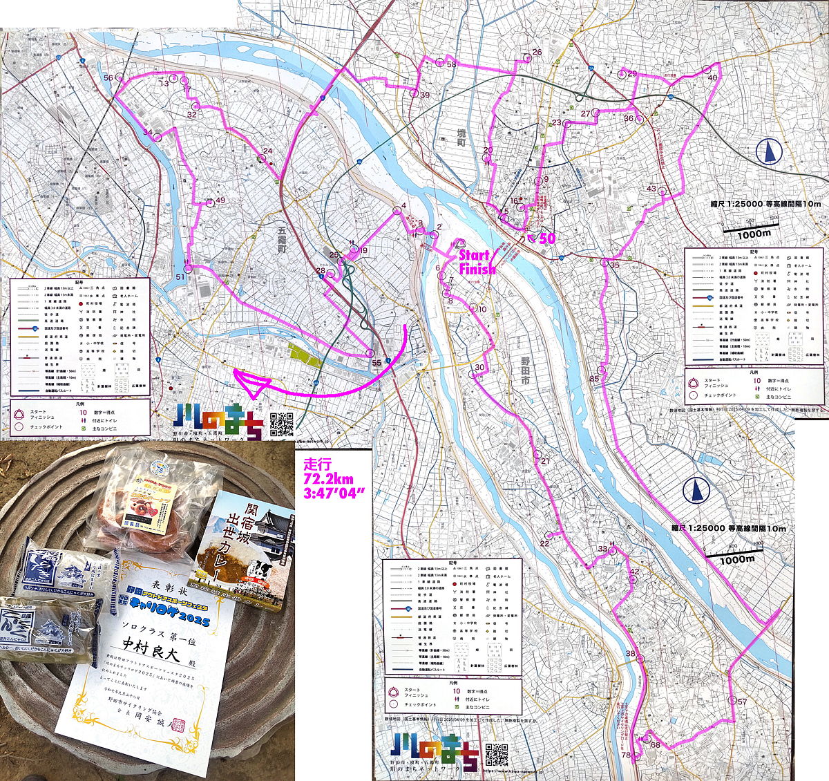 「川のまちチャリロゲ」は無料ながら参加者は30人ほどと、前回2年前の半分。言っちゃ悪いが、場所が辺鄙過ぎるんでないかい。受付を済ませたらもう地図等は見て良く、本格的な美しい作図がされている。1/25000縮尺A3サイズが“川のまちネットワーク”を構成する「野田関宿」「五霞町」「境町」の各ステージで計3枚。チェックポイントは43ヶ所+境町自動運転バスの合計44。写真例通りに撮り回る競技だ。