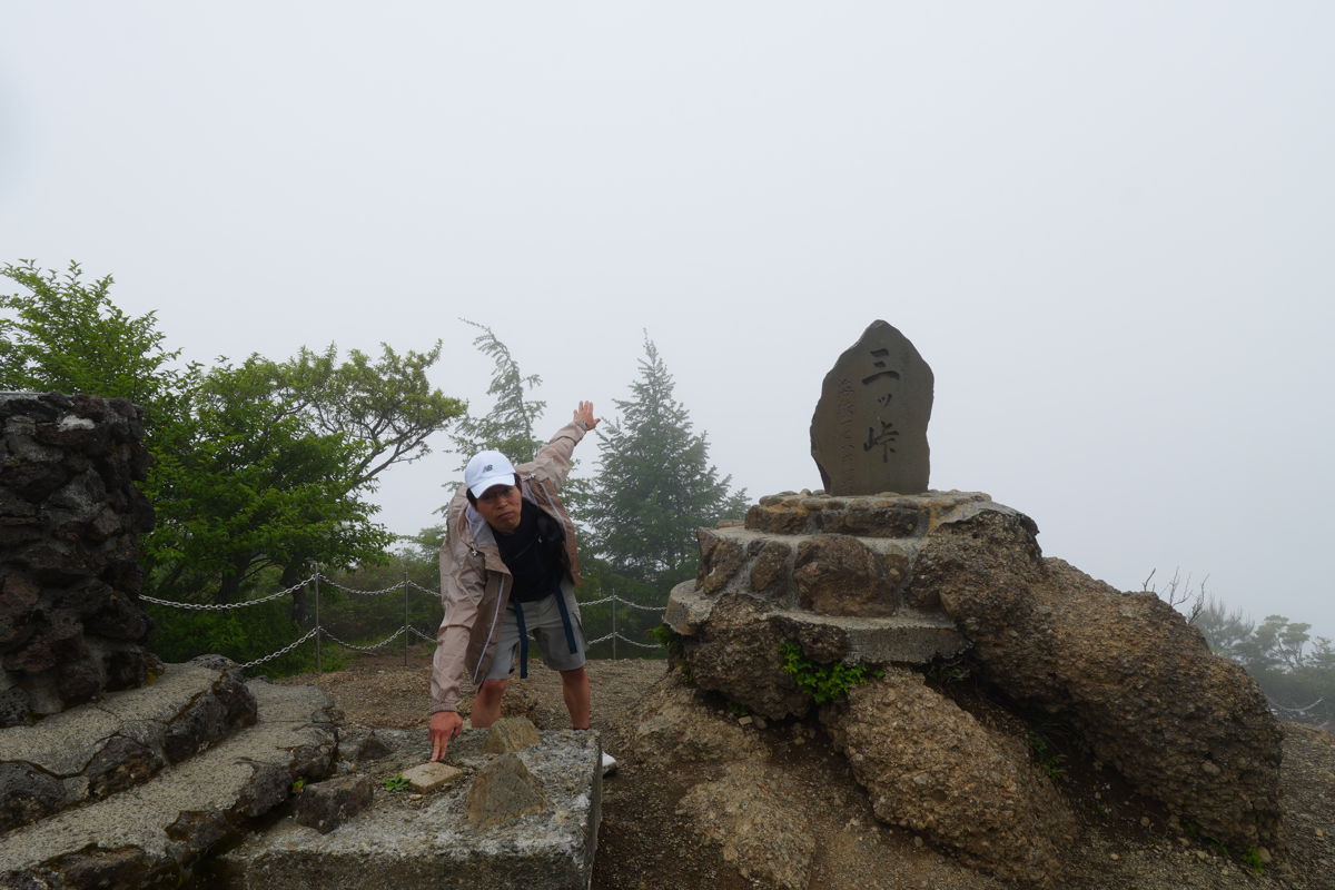 神鈴の滝を経て達磨石から本格的な登山道、キツイ。こんな天気にも関わらず往来する人々がいる。こんな天気にも関わらずロッククライミングしてる人々もいる。すっかりヘロヘロになって2時間40分、三ツ峠山頂に到達した。絶景のはずの標高1,786m、何も見えね〜。