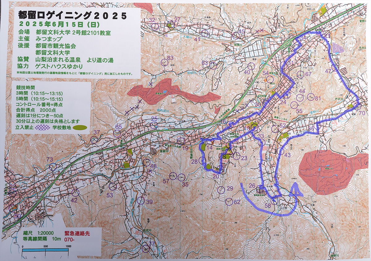 雨は上がりみるみる気温が上昇していく。富士急行線の都留文科大学駅で下車し、坂を登って大学二号館へ。教育系の好か、ここのサイクリング部は筑波大サイクリング部と以前交流があった事を思い出す。今日は「都留ロゲイニング2025」。三時間の部と五時間の部合わせて90名近く、DNSチームは無いと言う。10時15分スタート。
